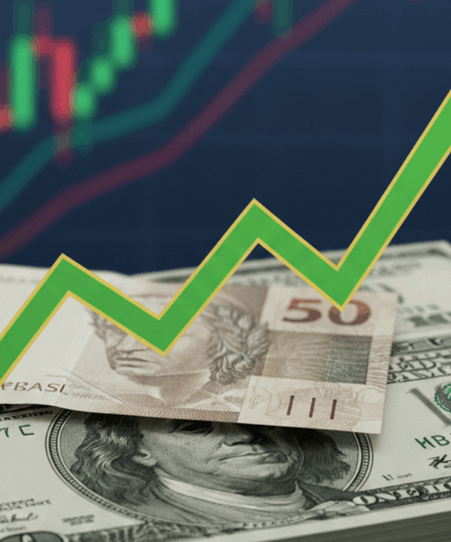 Notas de dólar e real com gráfico de alta representando o movimento do dólar hoje.