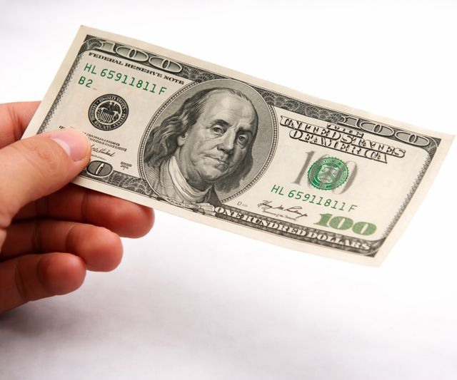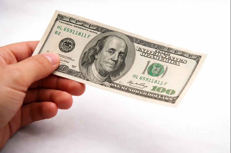Mão masculina segurando uma nota de 100 dólares, representando a queda do dólar frente ao real no encerramento do ano
