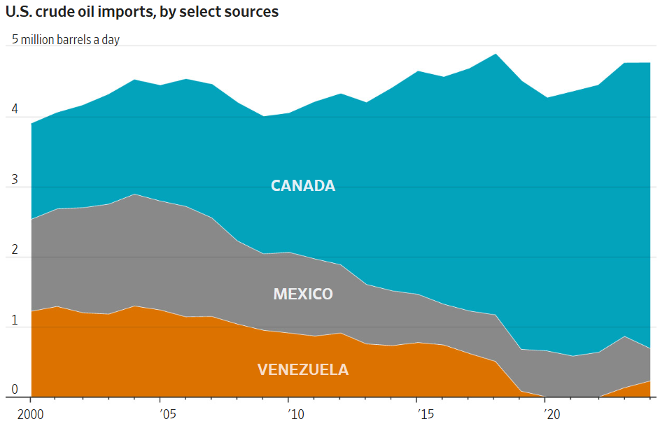 O resultado é que o Canadá hoje envia mais petróleo aos EUA do que todos os outros fornecedores internacionais somados, de acordo com o WSJ. O gráfico de importações mostra o Canadá dominando o volume ao longo do tempo, enquanto México e Venezuela perdem espaço, e registra que não houve importações reportadas da Venezuela entre julho de 2019 e dezembro de 2022.