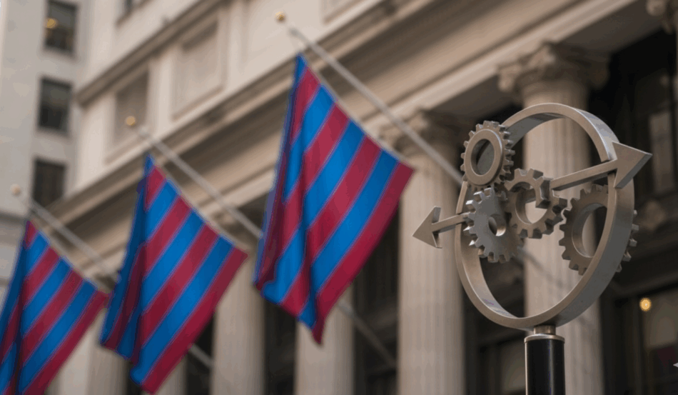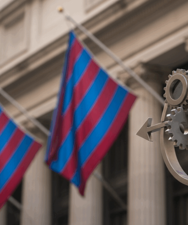 Detalhe de um poste com símbolo circular de engrenagens e setas, em primeiro plano, com bandeiras listradas de azul e vermelho e um edifício clássico em segundo plano