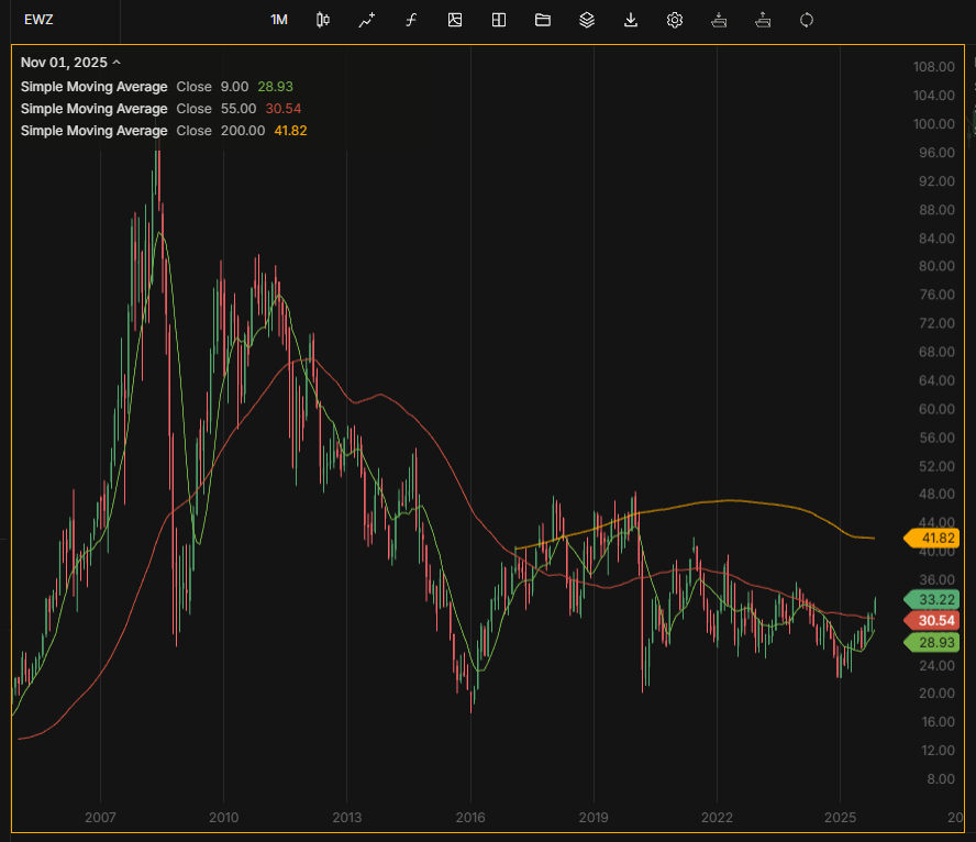 O comportamento do EWZ reforça que a narrativa de “Bolsa brasileira em topo” não se sustenta quando analisada sob a ótica global.