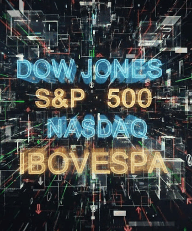 Painel digital com “Dow Jones, S&P 500, Nasdaq, Ibovespa” representando alta do mercado