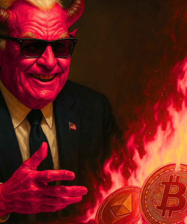 Ilustração de Bitcoin e Ethereum em chamas simboliza a queda das criptomoedas com a aversão ao risco global.