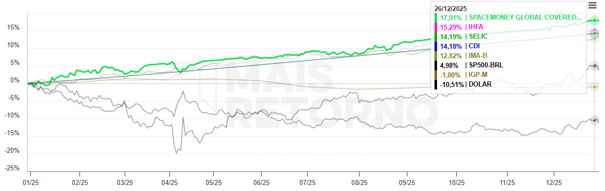 Além de render 124% do CDI, o SpaceMoney Global Covered Call superou, em 2025, diversos indicadores importantes do mercado brasileiro, entre eles: