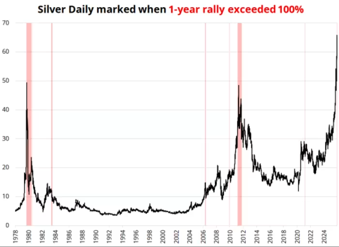 Historicamente, ciclos em que a prata registra ganhos superiores a 100% em um único ano tendem a ser seguidos por retornos mais fracos ou até negativos no período seguinte, segundo séries de longo prazo do próprio mercado de commodities.