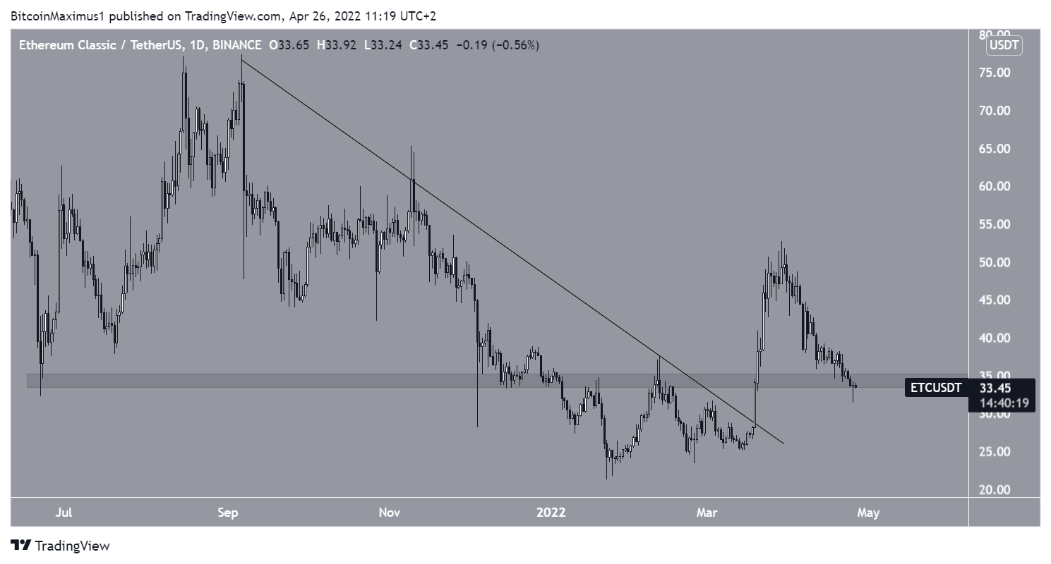 Até agora, o ETC conseguiu ficar dentro da área de suporte horizontal de US$ 34,50. No entanto, uma quebra abaixo dela pode ser o catalisador para uma queda acentuada.