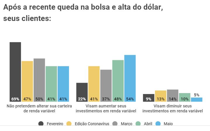 Segundo os assessores de investimento, o desejo de seus clientes de aumentar a exposição já vinha aumentando nos últimos meses, apesar da alta volatilidade das ações listadas na B3, a bolsa de valores brasileira. Em fevereiro, apenas 22% dos investidores adotavam esse viés, e a partir daí, mês a mês (ver o gráfico 1), o interesse vem crescendo até atingir seu ponto máximo em maio, em meio à pandemia da Covid-19 e ao cenário de crise política.
