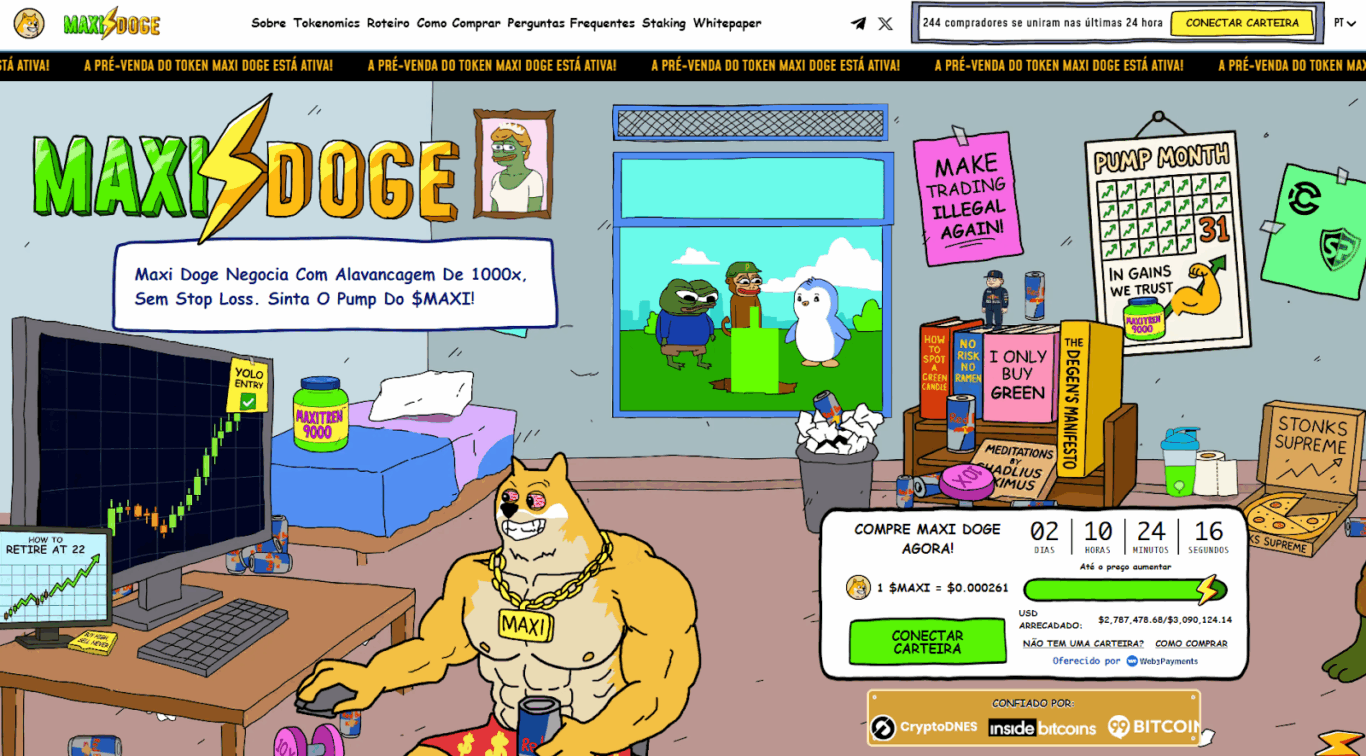 É por isso que todos os olhos agora estão se voltando para o MaxiDoge — a única entre as três que ainda está em pré-venda, com preço baixo e potencial de valorização extrema.