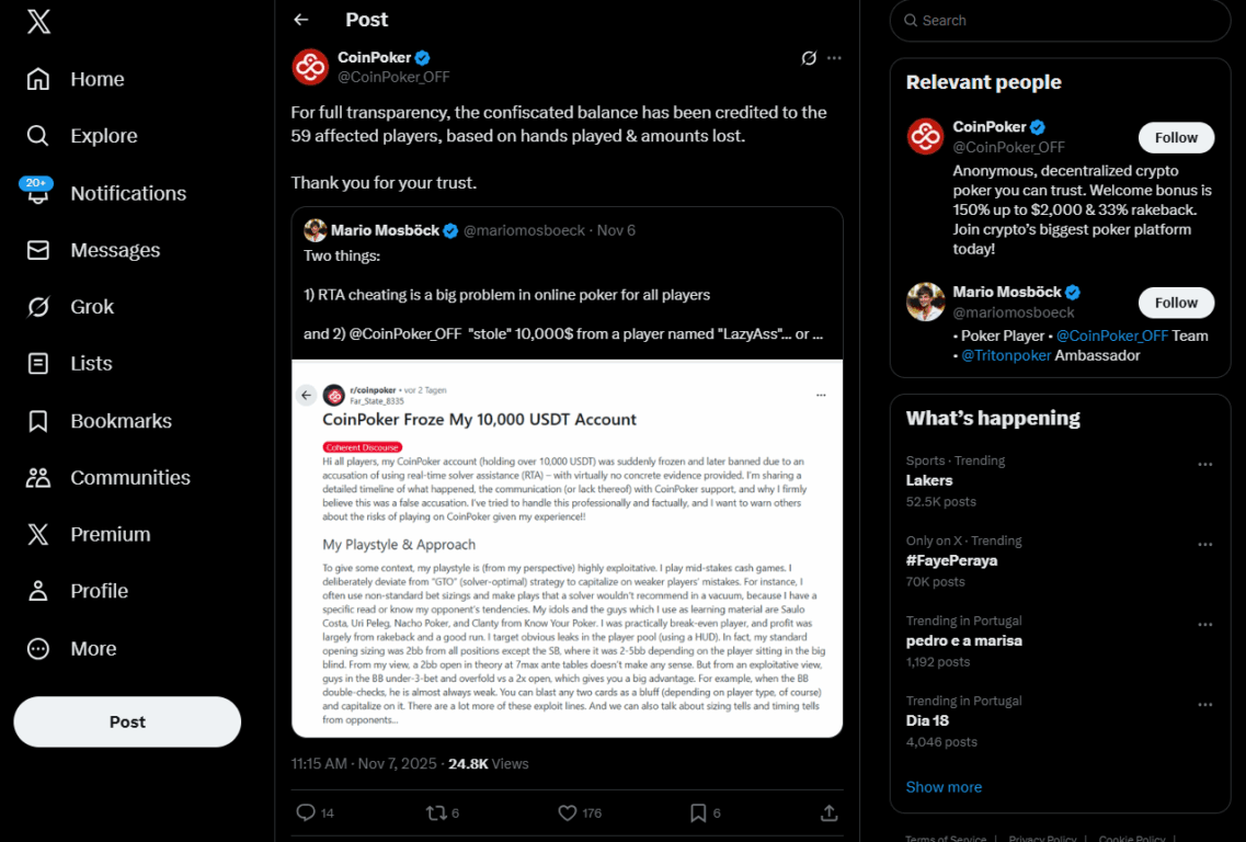 A CoinPoker afirma que mantém em sigilo parte das evidências e dos métodos utilizados para identificação da fraude, mas garante que todo o processo de restituição já foi concluído. A postura firme da plataforma recebeu elogios de nomes conhecidos do cenário internacional, que reforçaram a importância de medidas rígidas — especialmente em partidas de high-stakes — para preservar a segurança e a justiça no poker online.