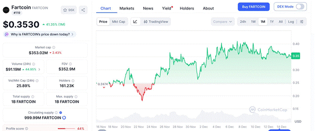 - Volume negociado ultrapassou US$ 164 milhões, o que representa mais de 40% da market cap circulante da Fartcoin;