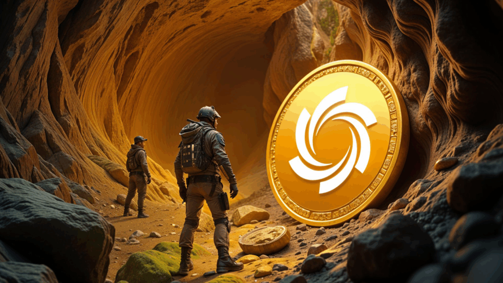 Exploradores diante de uma moeda dourada simbolizando o crescimento do token Ozak AI e seu potencial de mercado.