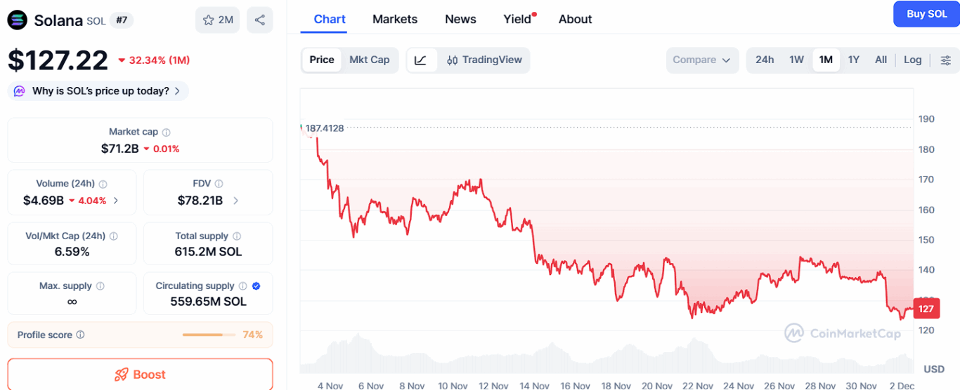 A Solana (SOL), negociada perto de US$ 127, tem mostrado resiliência consistente, sustentada por forte pressão compradora em US$ 121, US$ 115 e US$ 108 — níveis que repetidamente se mantiveram durante períodos de volatilidade. Esse padrão de acumulação reflete a crescente confiança entre holders de longo prazo e traders que veem a Solana como um dos ativos com melhor desempenho do ciclo.