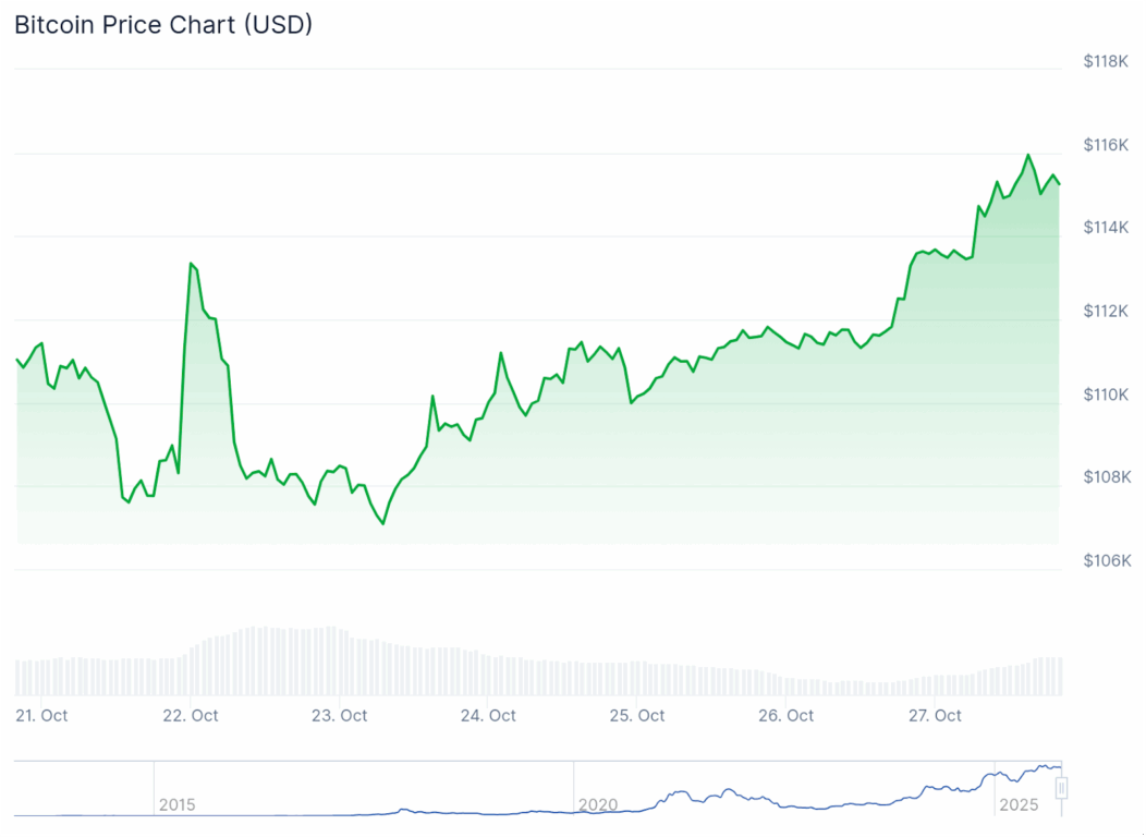 De acordo com dados da CoinGecko, o BTC valorizou 3,6% em um único dia, acompanhando a recuperação das bolsas americanas. Além disso, a plataforma Polymarket mostra 98% de probabilidade de o Federal Reserve reduzir as taxas em 25 pontos-base na reunião de 29 de outubro.