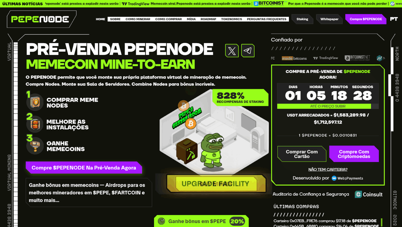 Outro nome que começa a ganhar tração no cenário cripto é o PepeNode (PEPNODE). Diferente das tradicionais memecoins, o projeto aposta em um modelo Mine-to-Earn, no qual os usuários são recompensados ao participar ativamente do processo de mineração em rede.