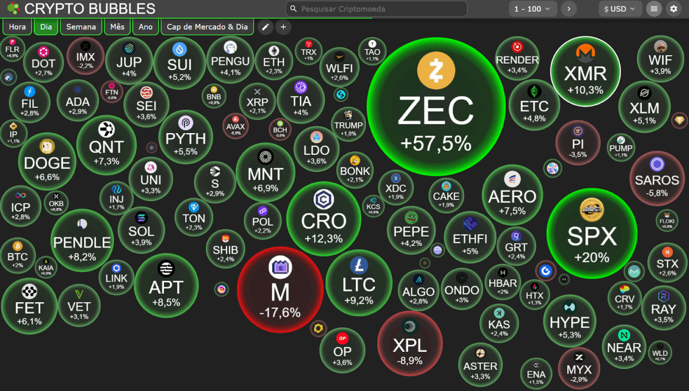 Altcoins relevantes como Ethereum (+2,3%), Cardano (+2,9%), Solana (+3,9%) e Litecoin (+9,2%) acompanham o movimento, enquanto projetos de menor capitalização experimentam ganhos ainda mais expressivos, como Zcash (+57,5%) e Cronos (+12,3%).