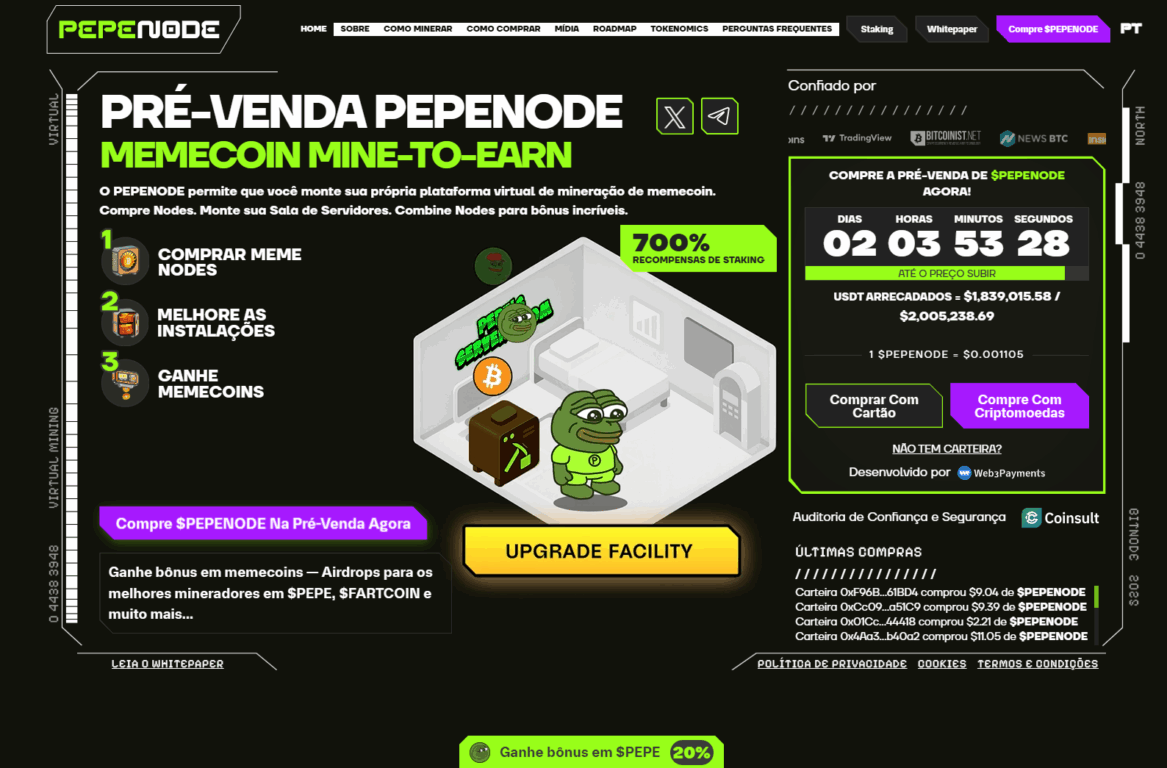 Com mais de US$ 1,8 milhão arrecadado e preço de apenas US$ 0,0011005, o PepeNode entrega um modelo novo, acessível e com alto potencial de multiplicação.